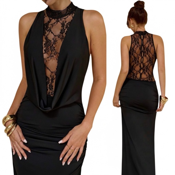 Długa DAMSKA suknia wieczorowa CZARNA koronka ŚWIĄTECZNA