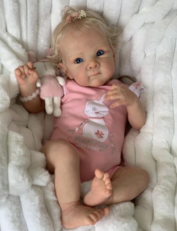 Lalka silikonowa ręcznie malowana. Rączki, nóżki i głowa silikonowa z zaznaczonymi liniami papilarnymi, włoskami, rumieńcami i wszystkimi detalami jakie posiada żywy noworodek. Brzuszek materiałowy, wypełniony, miękki. Nogi i ręce można przesuwać w różne strony.
