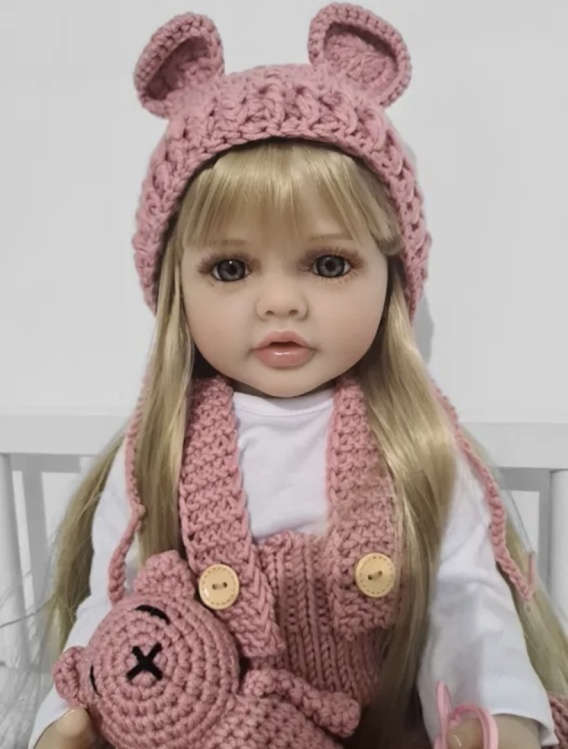 W zestawie: lalka REBORN, ubranko szydełkowane oraz czapka, butelka, smoczek magnetyczny, metryczka urodzenia lalki (do wypełnienia), buty, pampers i miś- przytulanka.